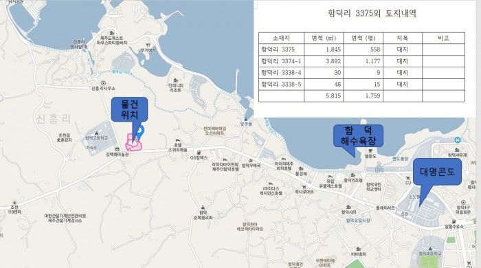 【매물 상세내역】◈ 매물위치 : 함덕고등학교 인근 일주도로접◈ 토지면적 : 5,815㎡ (1,759py)◈ 건물면적 : 659.49㎡ (199py)◈ 건물용도 : 제2종근린생활시설 두동 (철근콘크리트조)◈ 지 목 : 대지 ◈ 기반시설 : 수도. 전기. 오수 (기반시설완비)◈ 도로현황 : 20미터 (일주도로접) ◈ 추천용도 : 숙박시설. 근생시설등